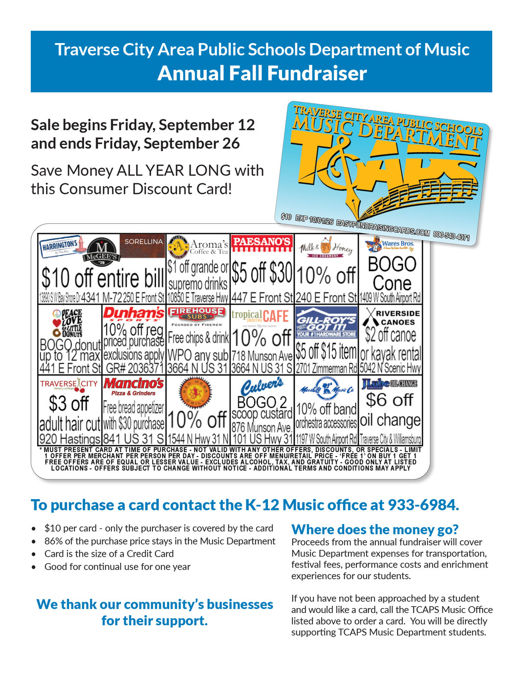 The TCAPS Music Department Discount Card Fundraiser is the best fundraiser EVER! It's the best for students because it's fast and easy and everyone wants to save money, not spend it! Everyone wants a card because cards are only $10 and they'll save more than they spend...it's a discount card! Discounts are offered to several area businesses and some even save you the $10 you spent with only one use! The best part...nearly 90% of the proceeds are profit! That's unheard of! Most fundraisers only return about 40% of the gross sales. Thank you to all of our local vendors for their generosity and thank you to all of our customers for supporting us too! It's a win-win for everyone!